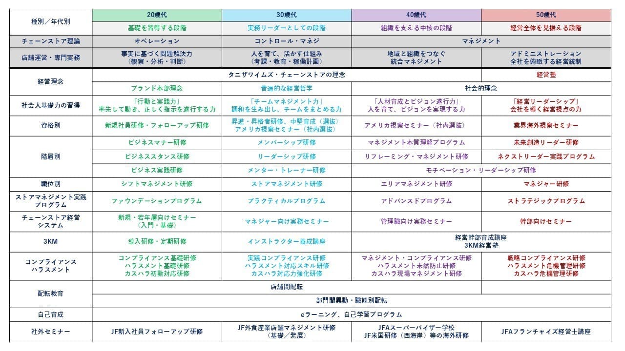 タニザワフーズの強みは「チェーンストア理論」です。全社員が学ぶ基盤として、役職や経験に応じた段階的研修を整備。理論を自社事例や課題改善と結びつけ、現場で実践できる内容にしています。学びを通じ社員は成長し、未来のリーダーへとステップアップします。