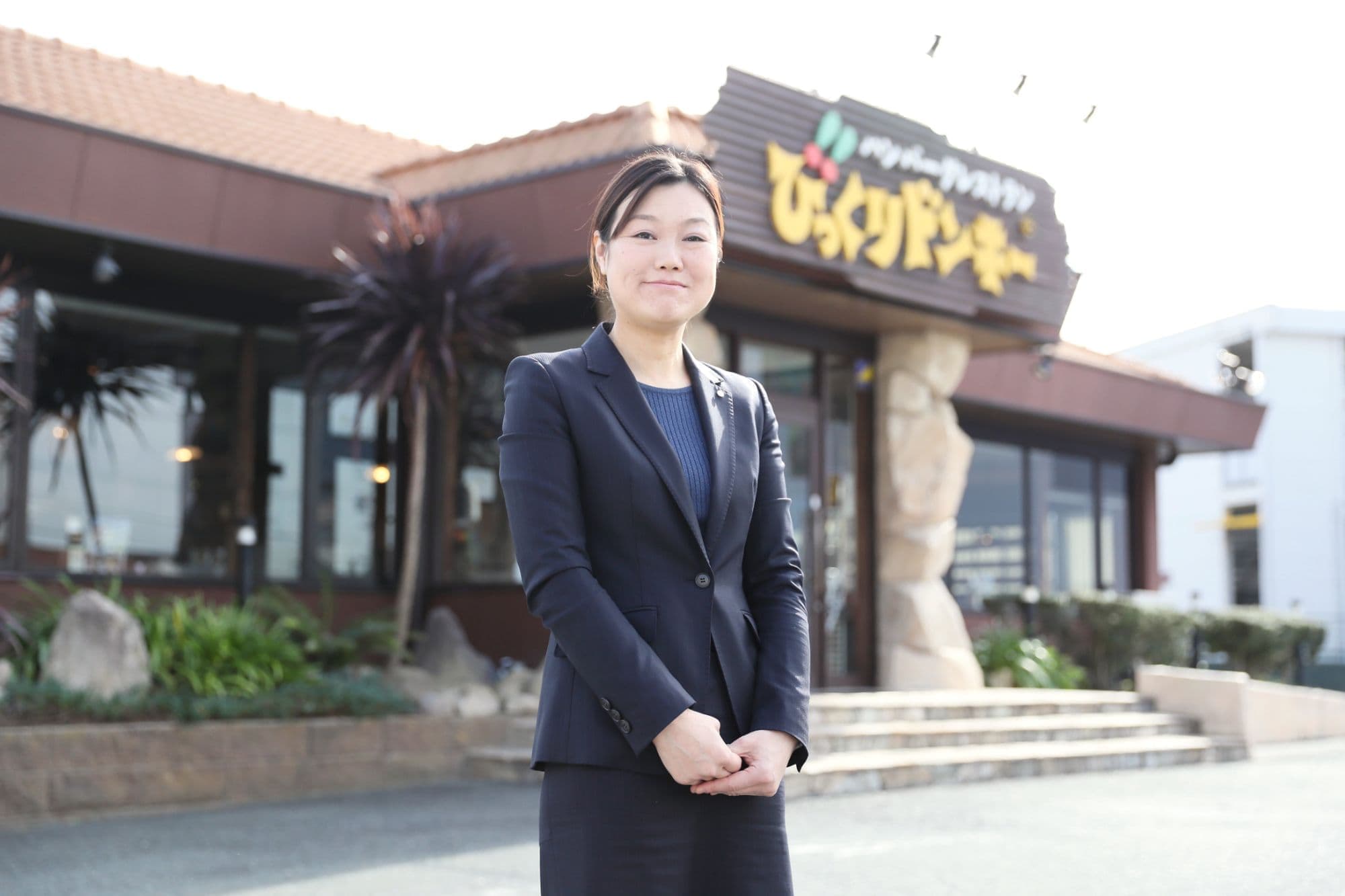 学生時代に外食店でのアルバイト経験があり、外食産業への就職を志望。ただ外食での仕事は厳しいと聞いており、不安はありました。そんな時、タニザワフーズで働く女性店長と話をする機会があり、店長がとても楽しそうに働いていたことと、私の悩みにもじっくり耳を傾けてくれたことが印象的で、この店長のように働きたいと思い、入社を決めました。以来、びっくりドンキーの店舗間で異動を経験し、店長経験を経て現在は2店舗を統括するエリアマネジャーに。各店舗の店長の育成をメインに店舗状態の管理や数値管理を行っていす。